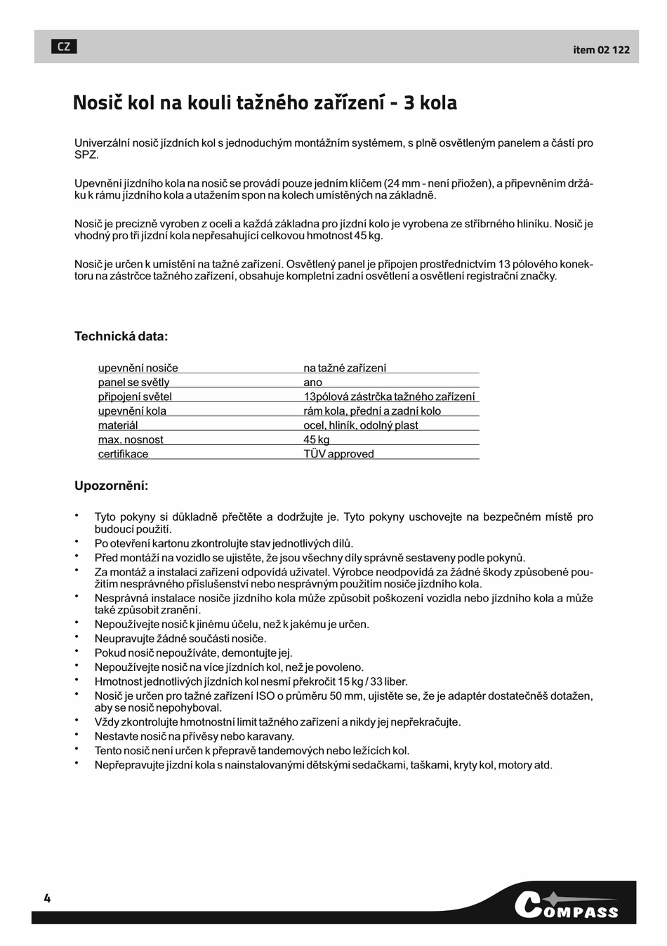 Nosič je určen pro tažné zařízení ISO o průměru 50 mm, ujistěte se, že je adaptér dostatečněš dotažen,