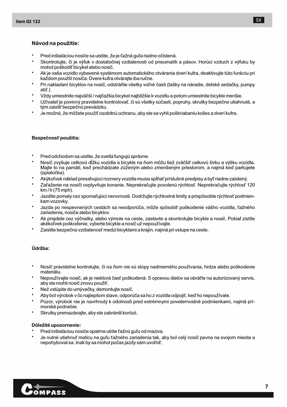 Užívateľ je povinný pravidelne kontrolovať, či sú všetky súčasti, popruhy, skrutky bezpečne utiahnuté, a