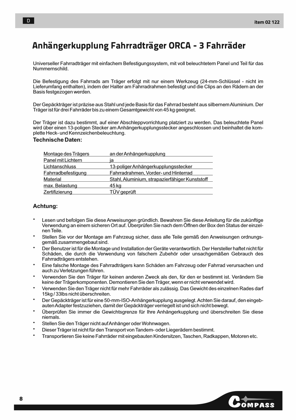 Dieser Träger ist nicht für den Transport von Tandem- oder Liegerädern bestimmt.