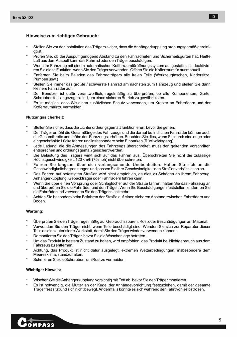 Überprüfen Sie den Träger regelmäßig auf Gebrauchsspuren, Rost oder Beschädigungen am Material.
