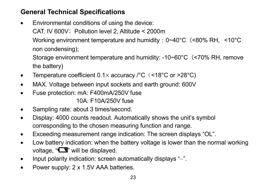 CAT. IV 600V; Pollution level 2, Altitude < 2000m
