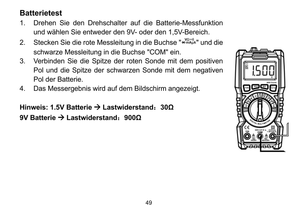 und wählen Sie entweder den 9V- oder den 1,5V-Bereich.