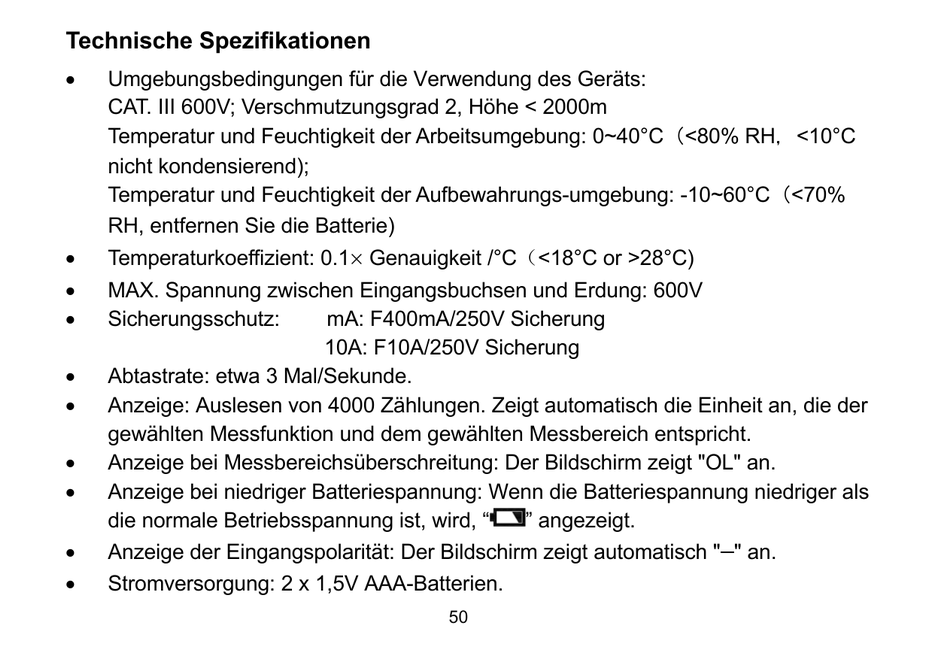 CAT. III 600V; Verschmutzungsgrad 2, Höhe < 2000m