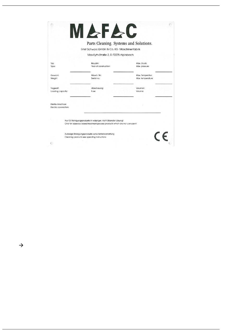 Auf dem Typenschild befinden sich wichtige Maschinendaten und Hinweise, sowie die CE-