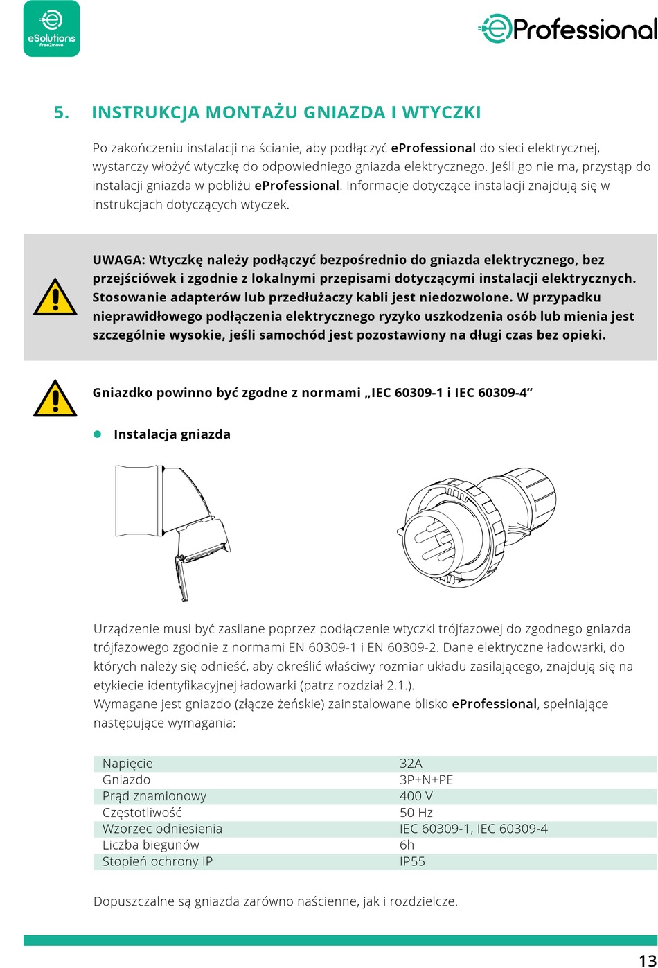 Wymagane jest gniazdo (złącze żeńskie) zainstalowane blisko eProfessional, spełniające