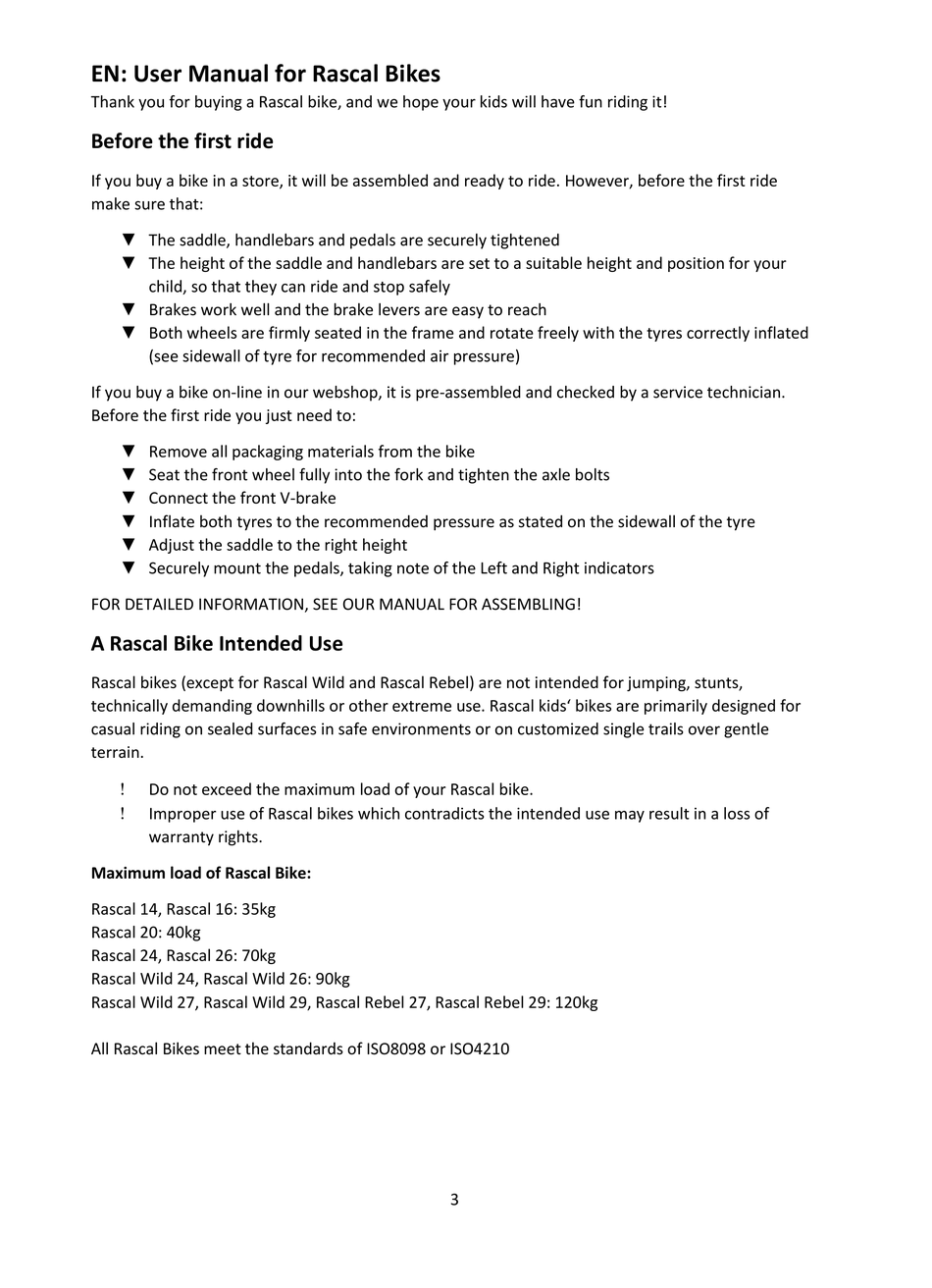 All Rascal Bikes meet the standards of ISO8098 or ISO4210