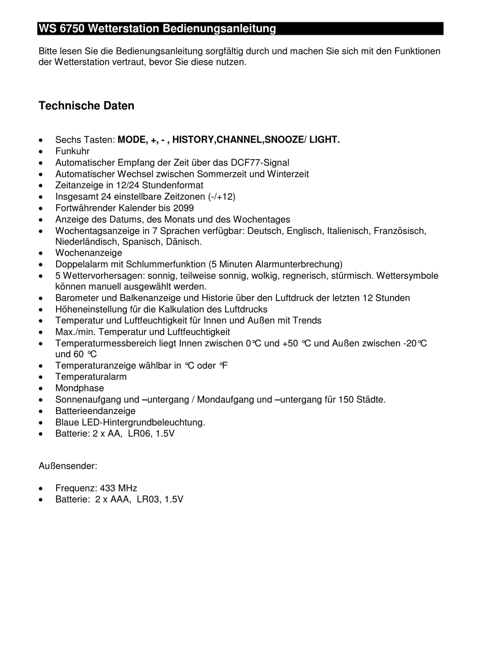 WS 6750 Wetterstation Bedienungsanleitung