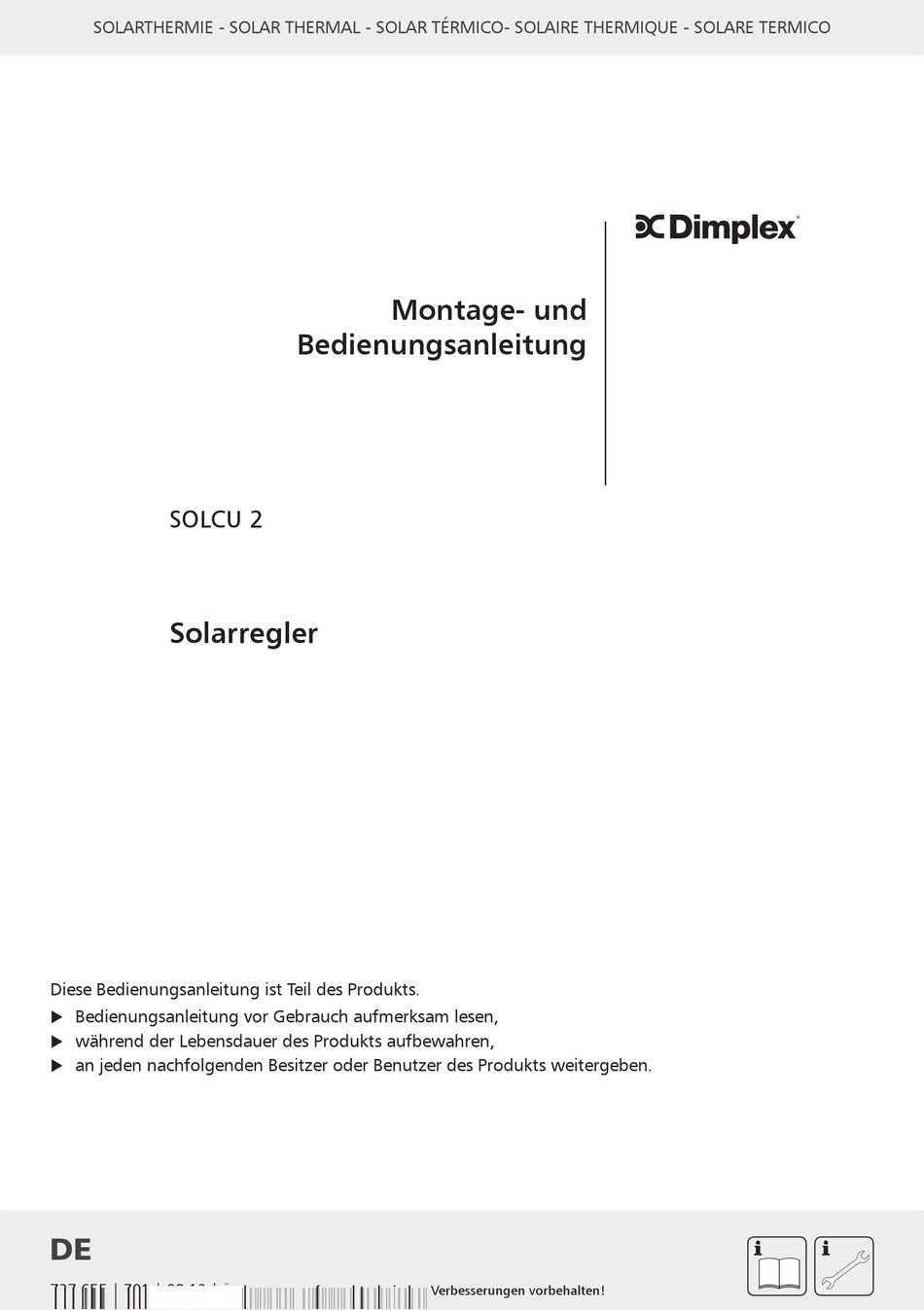 SOLARTHERMIE - SOLAR THERMAL - SOLAR TÉRMICO- SOLAIRE THERMIQUE - SOLARE TERMICO Montage- und Bedienungsanleitung SOLCU 2 Solarregler Diese Bedienungsanleitung ist Teil des Produkts. Bedienungsanleitung vor Gebrauch aufmerksam lesen, während der Lebensdauer des Produkts aufbewahren, an jeden nachfolgenden Besitzer oder Benutzer des Produkts weitergeben.