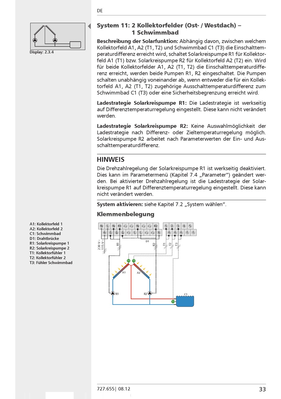 Kollektorfeld A1, A2 (T1, T2) und Schwimmbad C1 (T3) die Einschalttem-