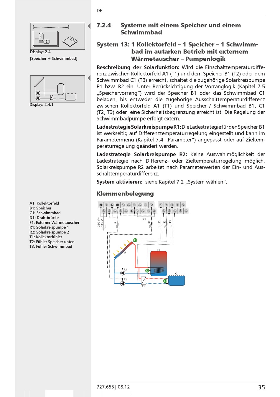 zwischen Kollektorfeld A1 (T1) und Speicher / Schwimmbad B1, C1